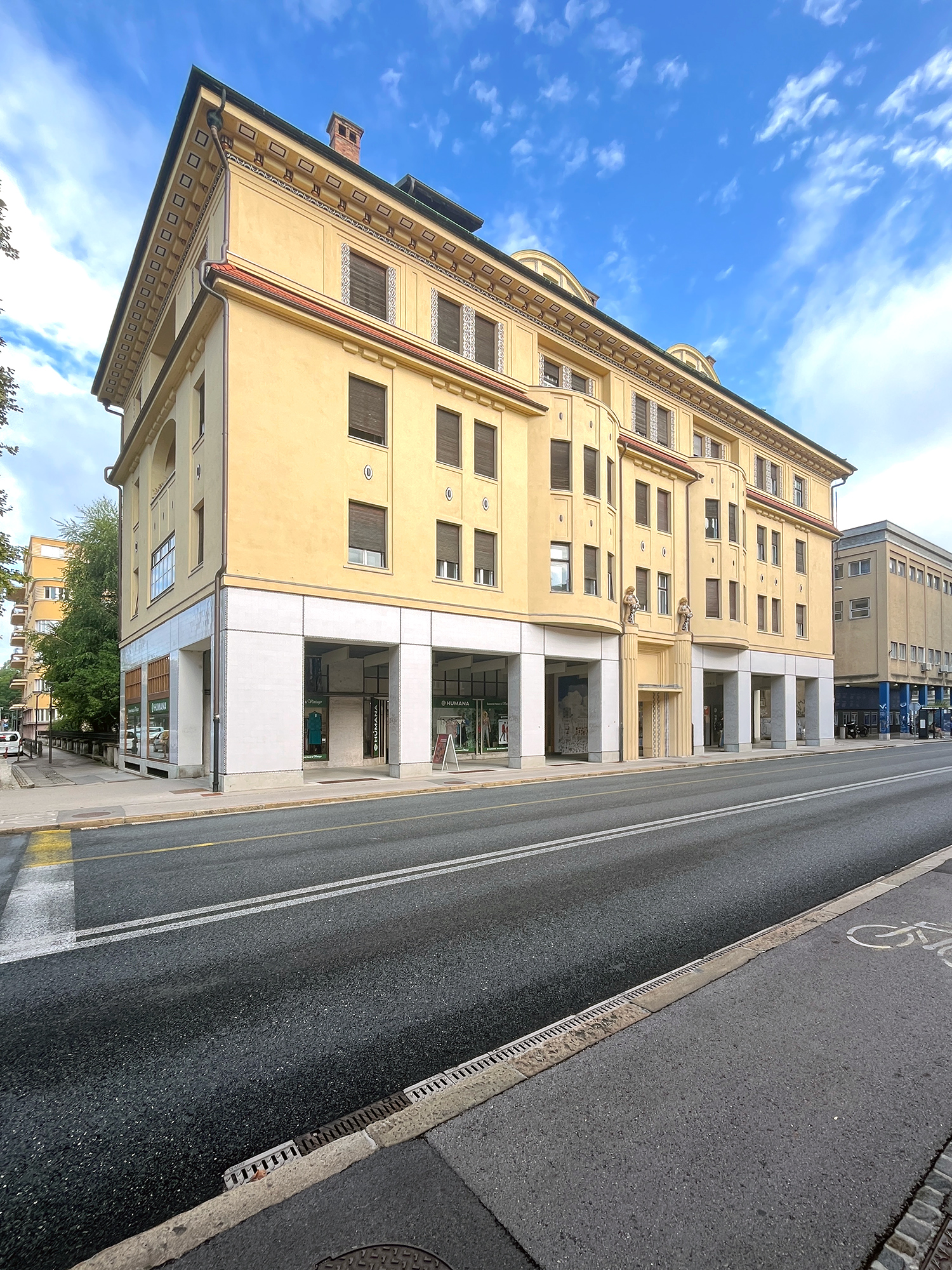 Krilo z lokali v pritličju stoji ob Slovenski cesti, označuje pa ga arkadna pasaža, ki je bila v stavbo vrezana ob razširitvi Titove ceste po drugi svetovni vojni. Stavba se tako vključuje v raznolik stavbni niz ob Slovenski cesti. V 30. letih 20. stoletja ji je bil ob Igriški dozidan Mali nebotičnik.