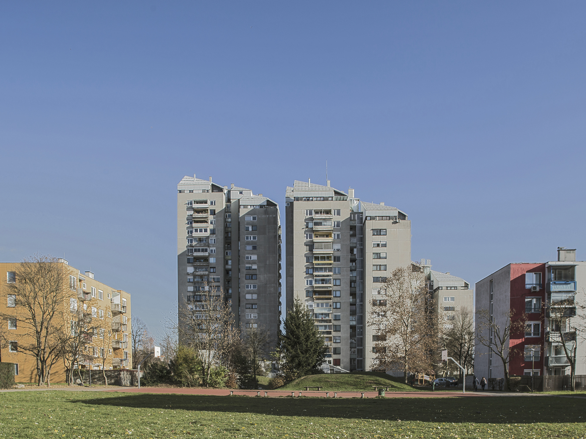 Gruči stolpnic stojita na vzhodnem robu soseske ob Vojkovi. Posamezno gručo sestavljajo po trije sklopi stolpnic in te po štirje stolpiči. Stolpiči so različno visoki, horizonatlno zamaknjeni in povezani z vertkalnimi komunikacijami in servisnimi balkoni. Razporejeni so po treh stranicah osrednjega trga z atrijem, ki se odpira proti žalski ravnici na vzhodu. Posebnost stolpičev so trikotno zašiljene bele ‘’strešne kape’’, ki so nekoliko ločene od betonskih vertikalnih teles. V njih so stanovanja z velikimi terasami, na katera se odpirata dnevni prostor in jedilnica. Spalni prostori so od dnevnih povsem ločeni. Stolpnice so zgradili s sistemom težke montaže z velikimi betonskimi paneli.